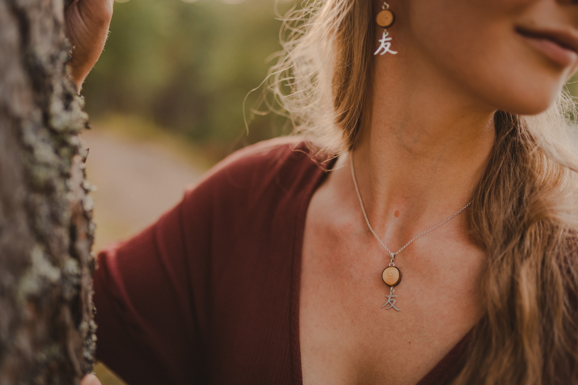 Ihmisen ja luonnon välistä ystävyyttä kuvastavissa Metsän ystävä -koruissa on japaniksi ystävää tarkoittava kirjoitusmerkki eli kanji. Metalliosat ovat laadukasta nikkelivapaata sterling hopeaa.