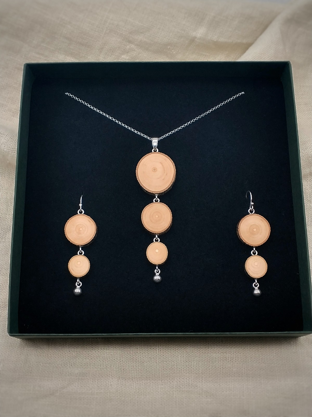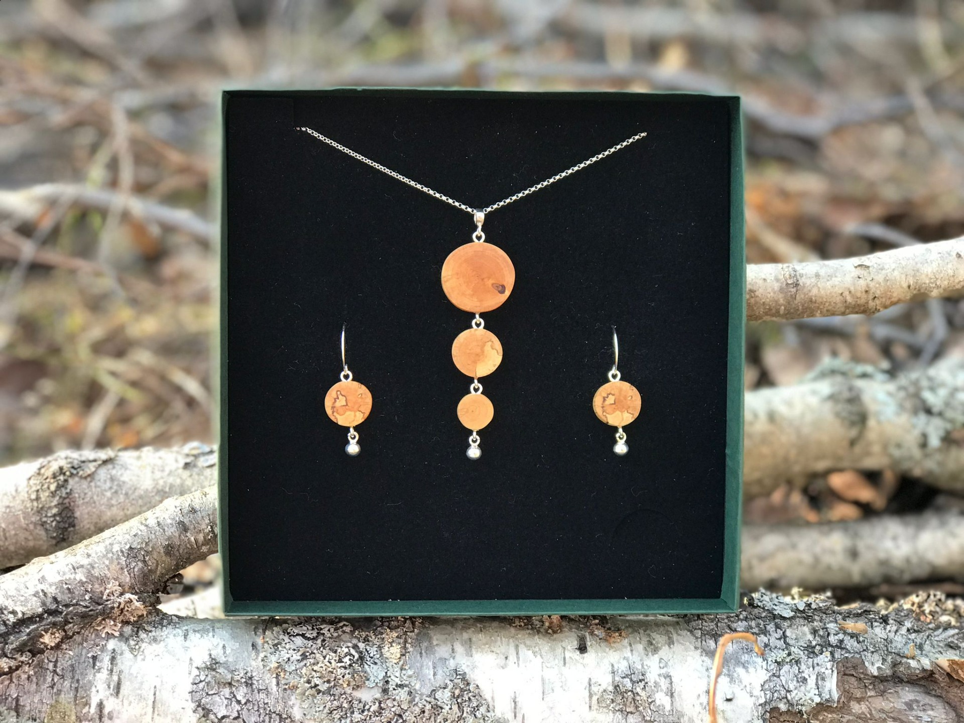 Asiakkaan rakkaan kaadetun pihakoivun oksista valmistettu setti, johon kuuluu pienet Helmenkantaja-korvakorut ja kolmiosainen riipus pitkässä ketjussa.