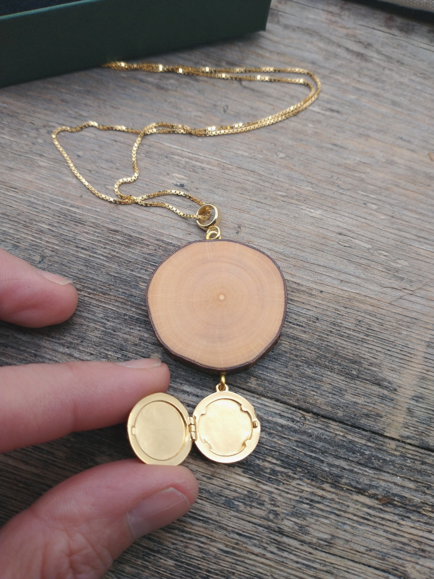 Asiakkaan toiveesta toteutettu kaulakoru, jossa puuosaan on kiinnitetty kullattu hopeamedaljonki.