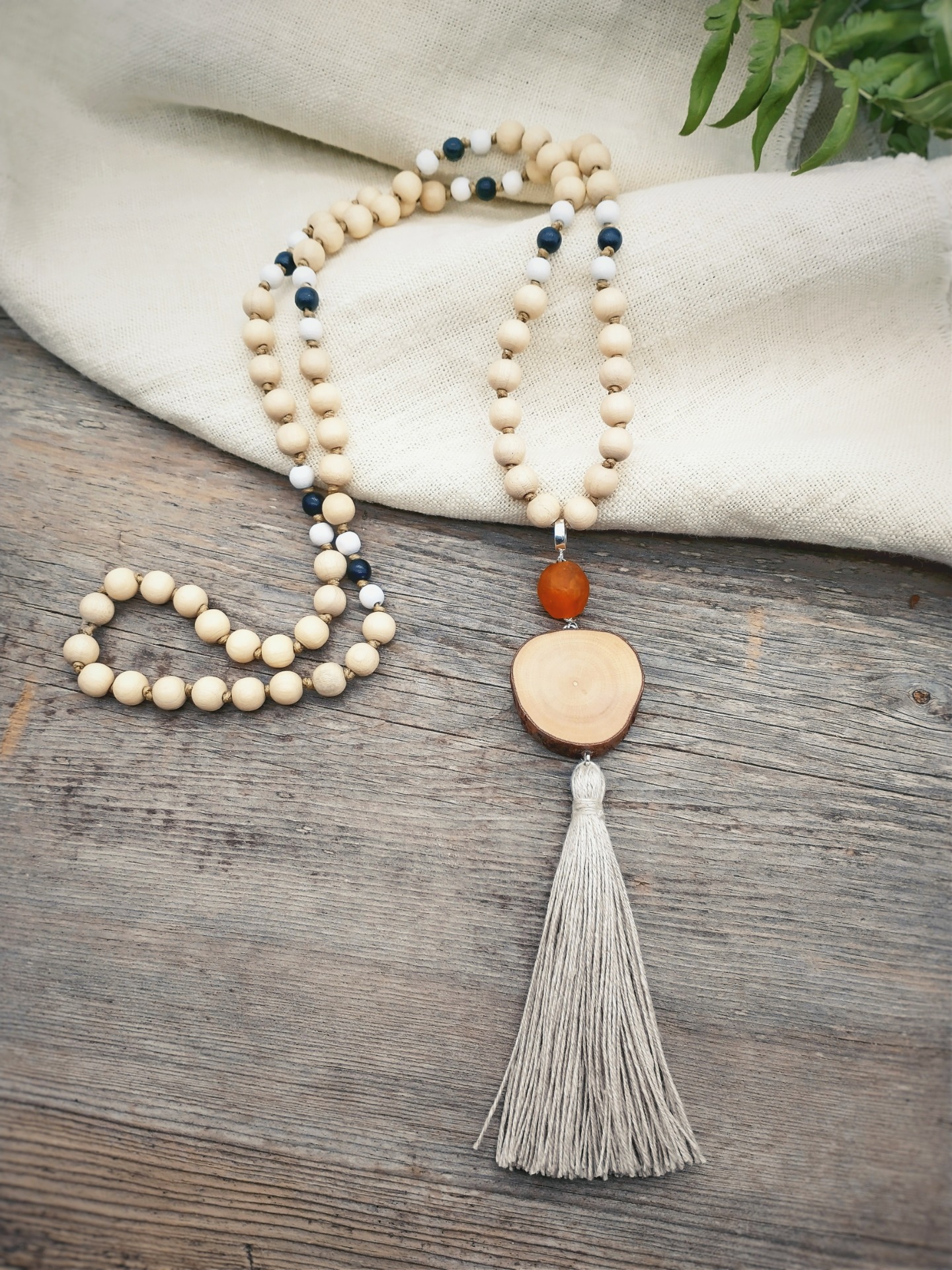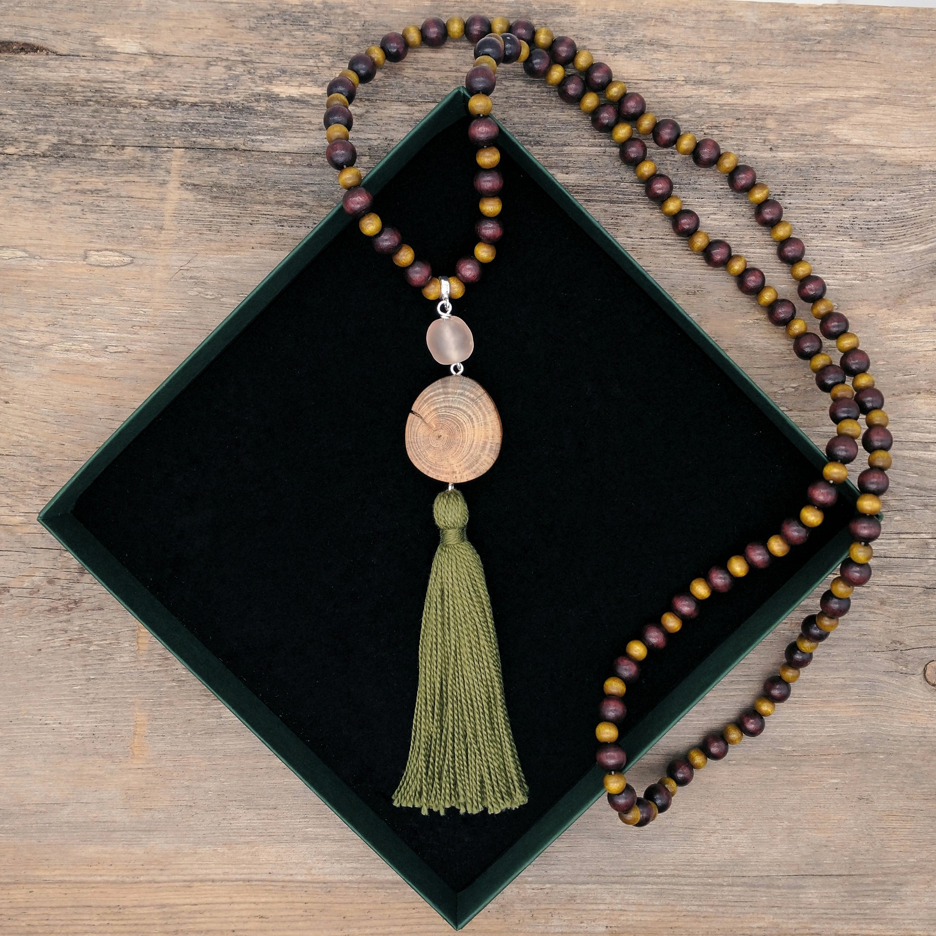 Pitkä mala-kaulakoru männynjuuresta, puuhelmistä ja isosta kierrätyslasihelmestä, johon asiakas valitsi itse helmien ja tupsun värit.