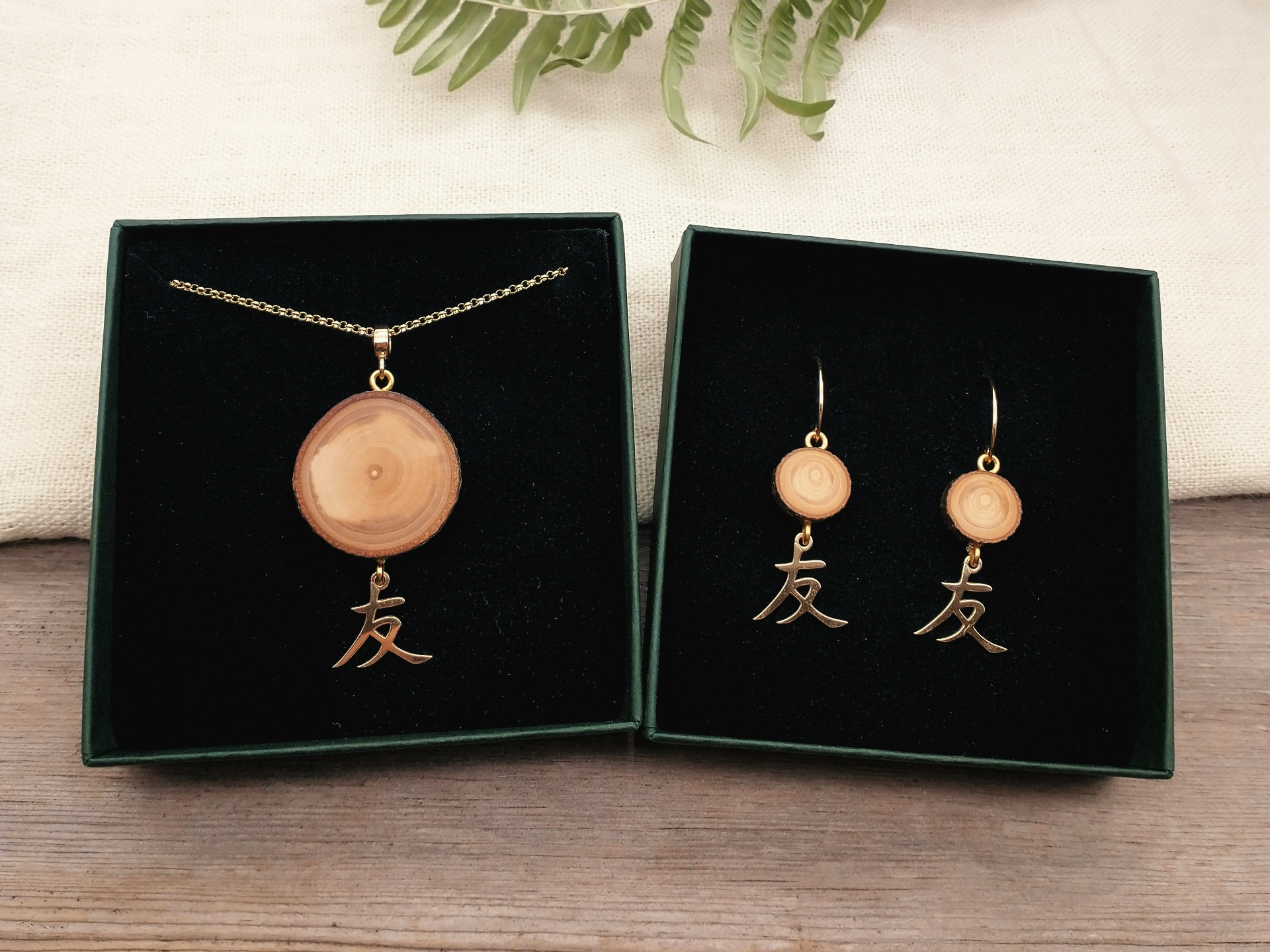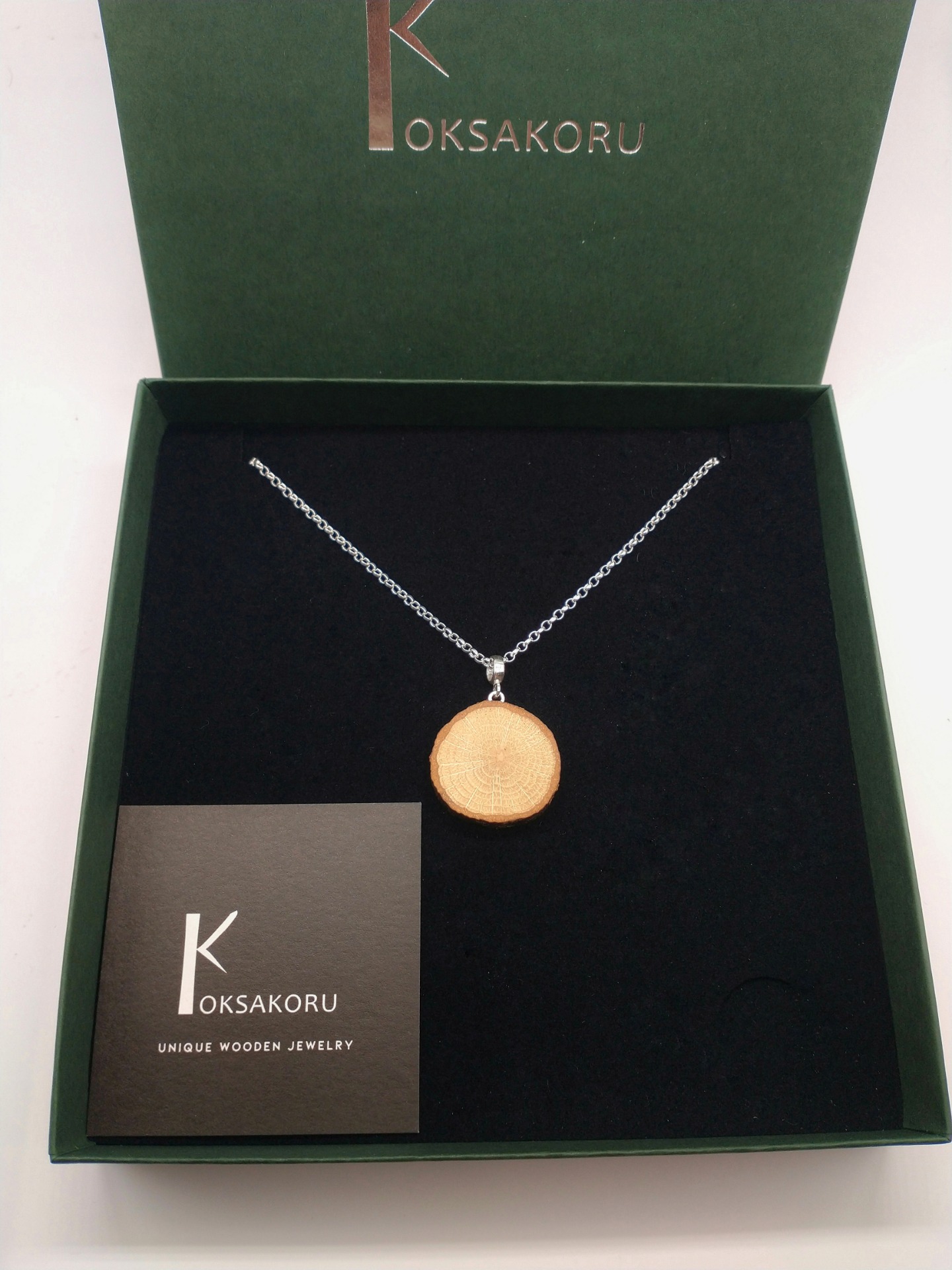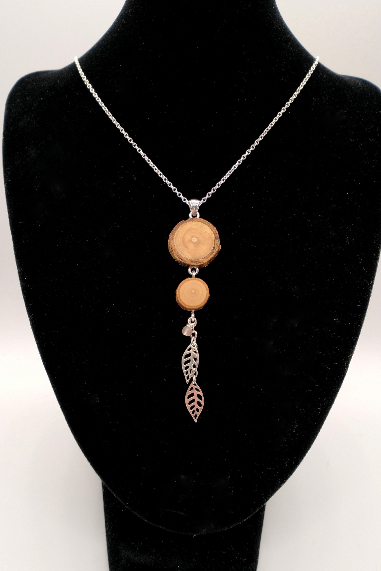 Asiakkaalle merkityksellisestä kaadetusta puusta valmistettu kaksiosainen kaulakoru, johon on kiinnitetty lasihelmi ja kaksi hopeista lehteä.