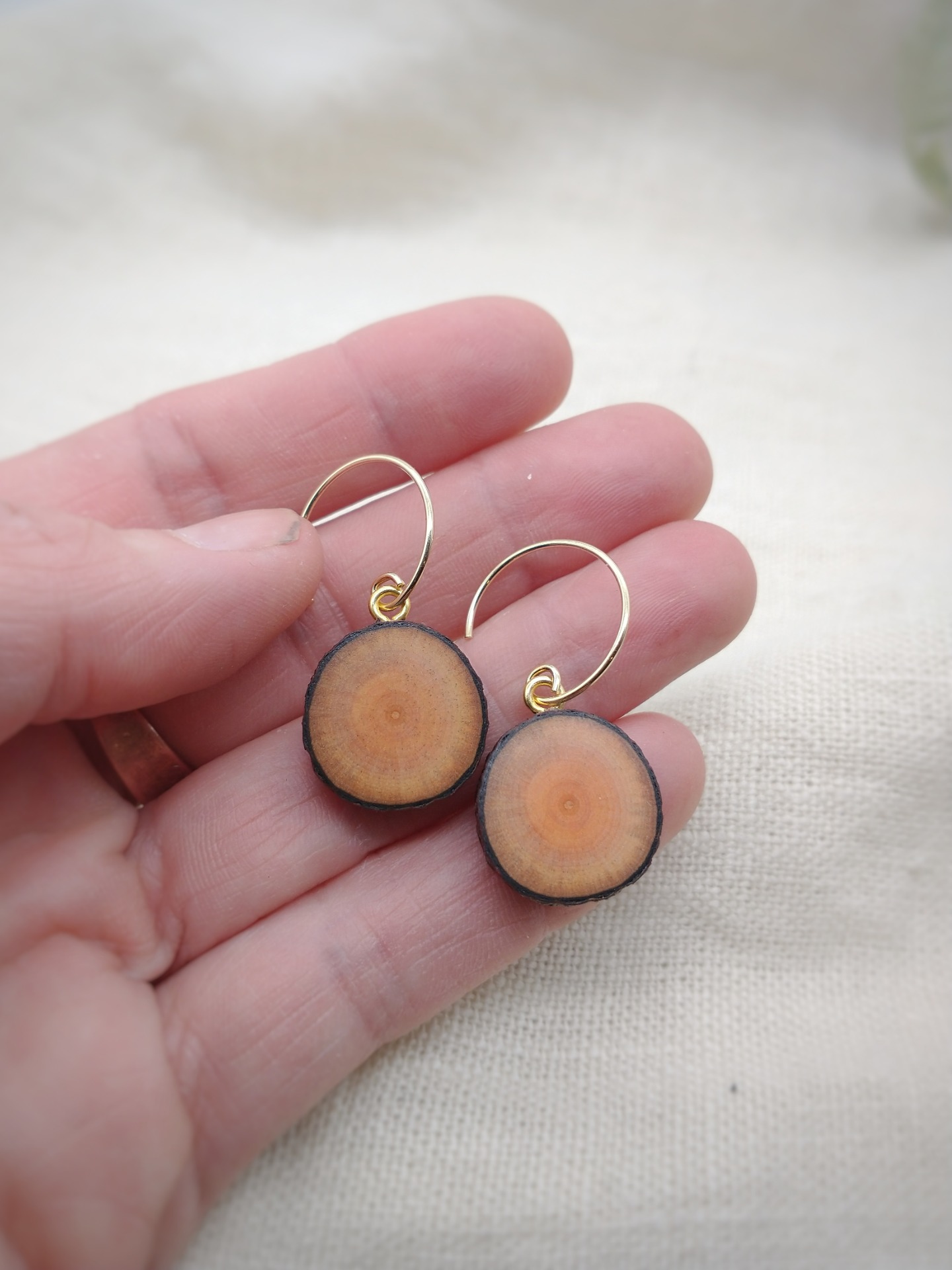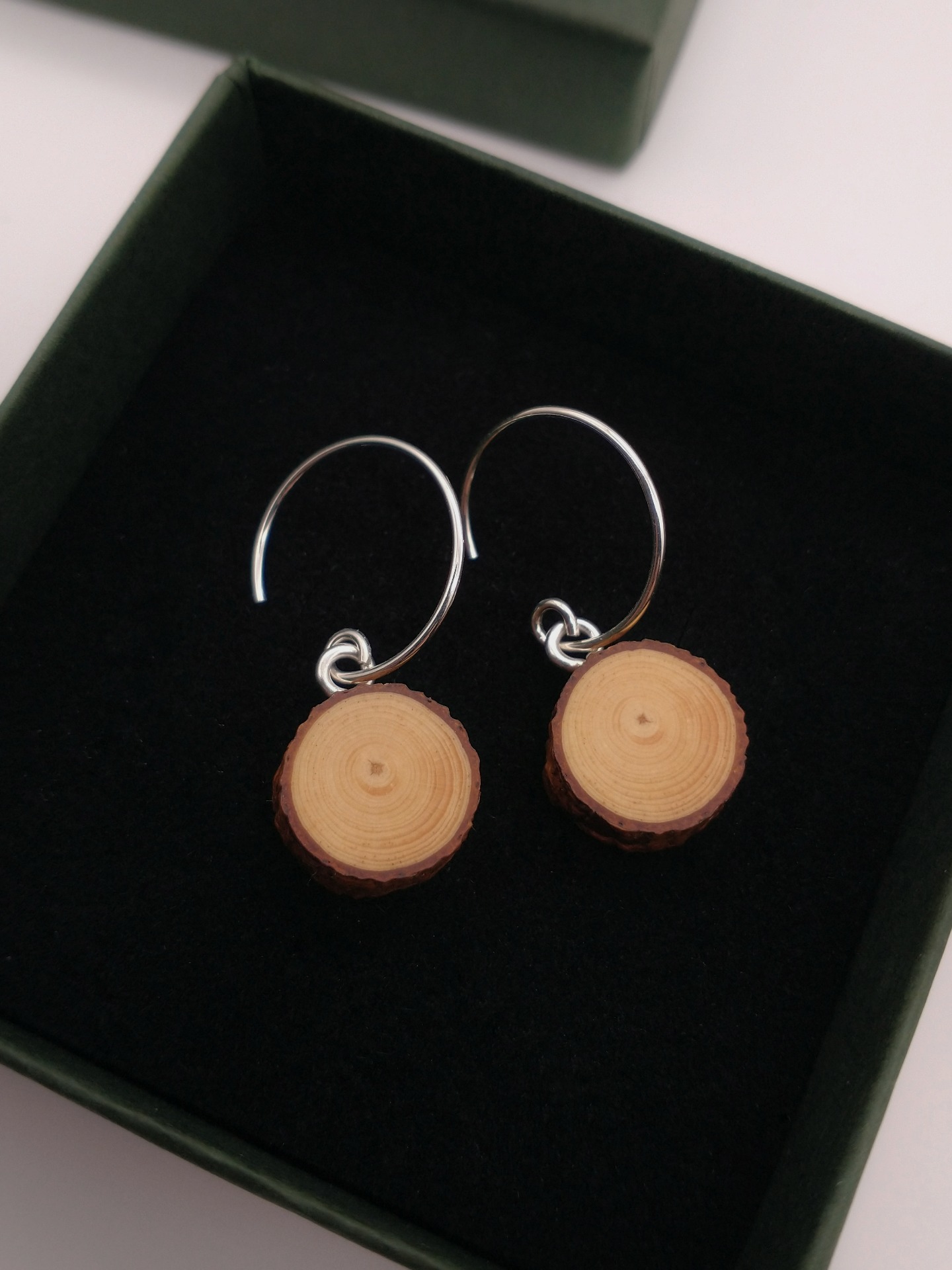 Asiakkaan toiveesta valmistetut pienet korvakorut männynoksasta ilman hopeisia riipusosia.