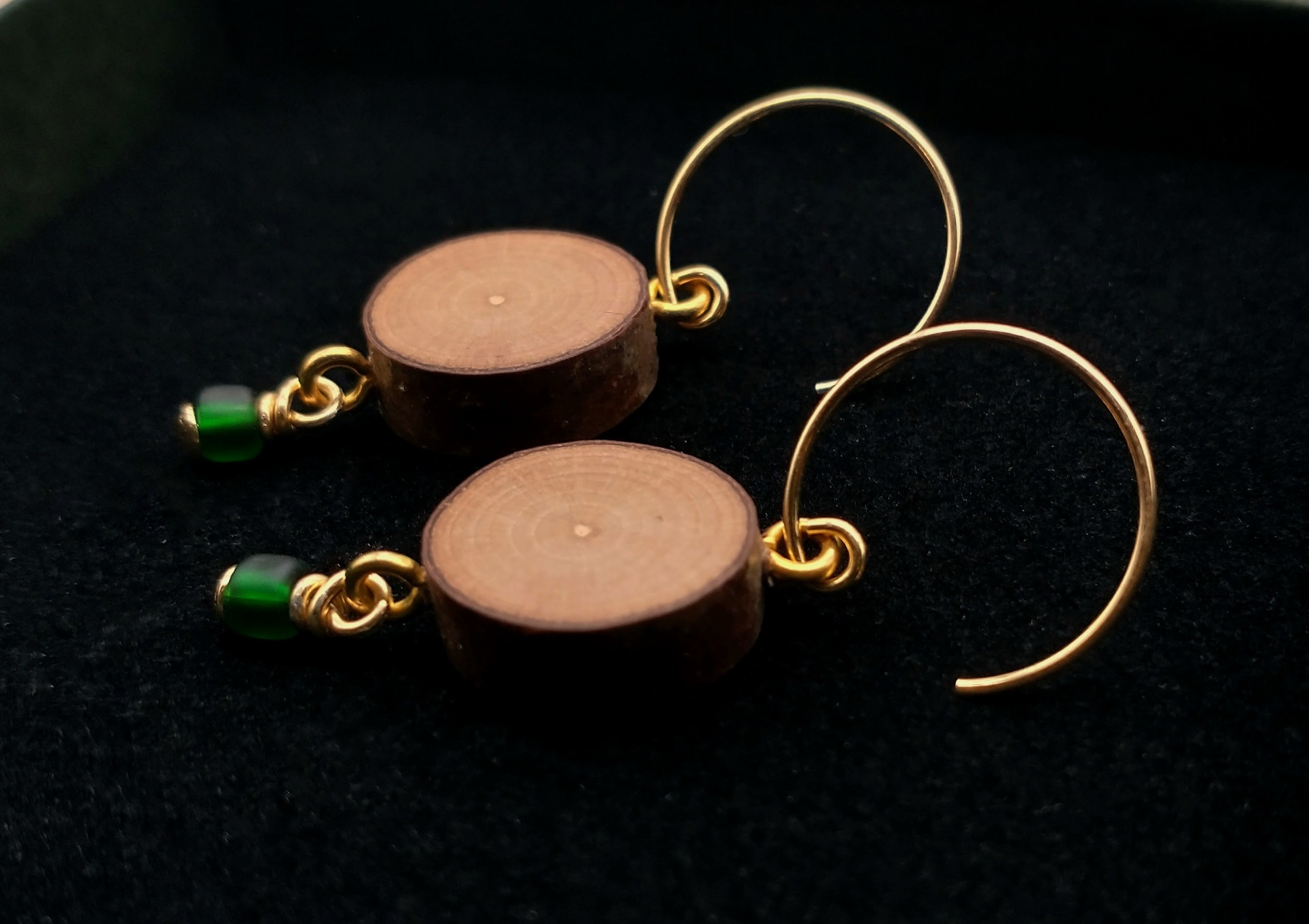 Pähkinäpuun oksasta valmistetut korvakorut kullatuilla hopeaosilla ja vihreällä lasihelmellä.